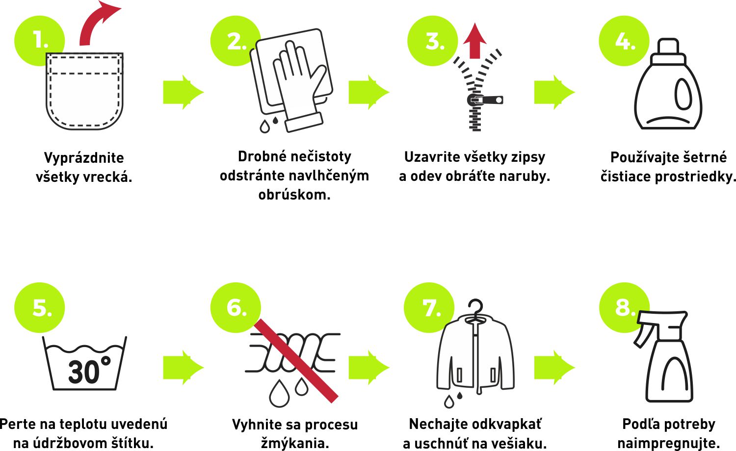 Nasledujúce informácie sú sprievodcom starostlivosti o produkty zo softshellového materiálu, avšak ide o bežnú prax aplikovateľnú na väčšinu našich odevov. Vždy si však pred praním najprv prečítajte údržbový štítok!